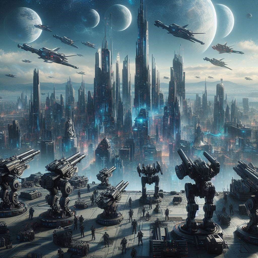 Cibola, die Hauptstadt des Planeten Vector Prime, während der Hinrady-Invasion von 2899. Die Landungsschiffe der Hinrady starten im Hintergrund ihren Angriff, während sich im Vordergrund Elemente der 98. Luftverteidigungslegion gefechtsbereit machen.